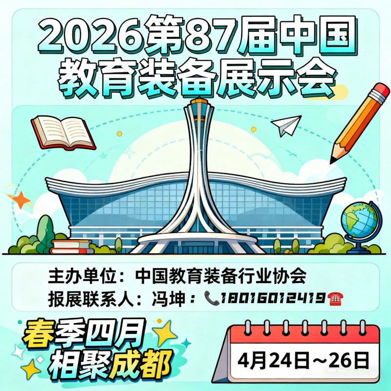 由中国教育装备行业协会主办,四川省教育厅、成都市人民政府承办的“第87届中国教育装备展示会”,将于2026年4月24日-26日在四川成都中国西部国际博览城国际展览展示中心隆重举行。在此,我们向全国各地教育界的同仁、教育装备生产经营企业的朋友们,以及所有关心教育事业的各界人士,发出最诚挚的邀请!