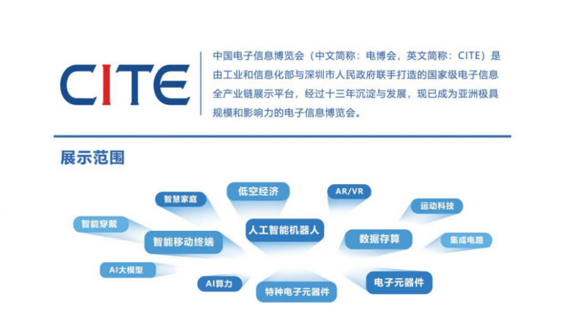 中国电子信息博览会(中文简称:电博会,英文简称:cite)是中国规模、具国际影响力的电子信息产业盛会之一。经过十三年的发展,电博会吸引了来自全球各地的参展商和观众,展示了中国电子信息产业的新成果和技术发展趋势。电博会以“全球 视野,国际,创新,服务产业”为理念, 不仅为中国电子信息产业的国际交流和合作提供了重要平台,同时为产业链上下游 协同创新提供了高效交流平台,促进电子信息产业与国民经济各领域进一步融合赋能,推动中国数字经济实现高质量发展。
