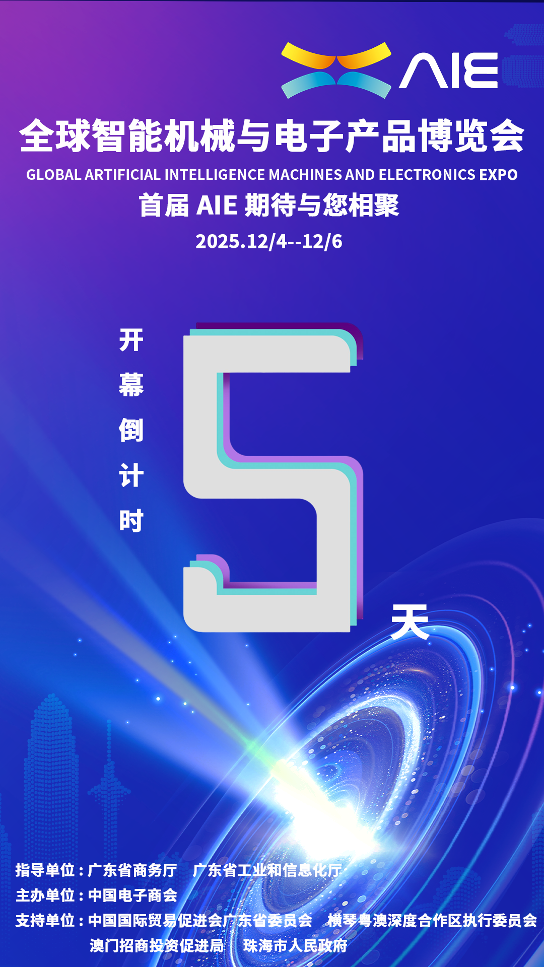 2025全球智能机械与电子产品博览会(aie)以“湾区智造 全球共享”为主题,将于12月4日-6日以“一展双城”的模式在澳门和珠海同步举办。展会期间将配套1场开幕式、1个主旨论坛、6大主题展览以及多场分论坛、新品发布活动、科技项目路演等系列活动,届时将有超过1000家全球科技先锋企业、7万名专业观众、5000名国际采购商共襄盛会。