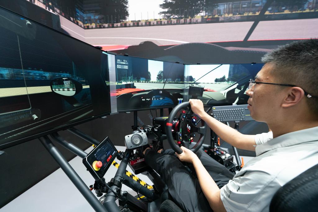 9月11日,参观者在体验六自由度赛车模拟器。