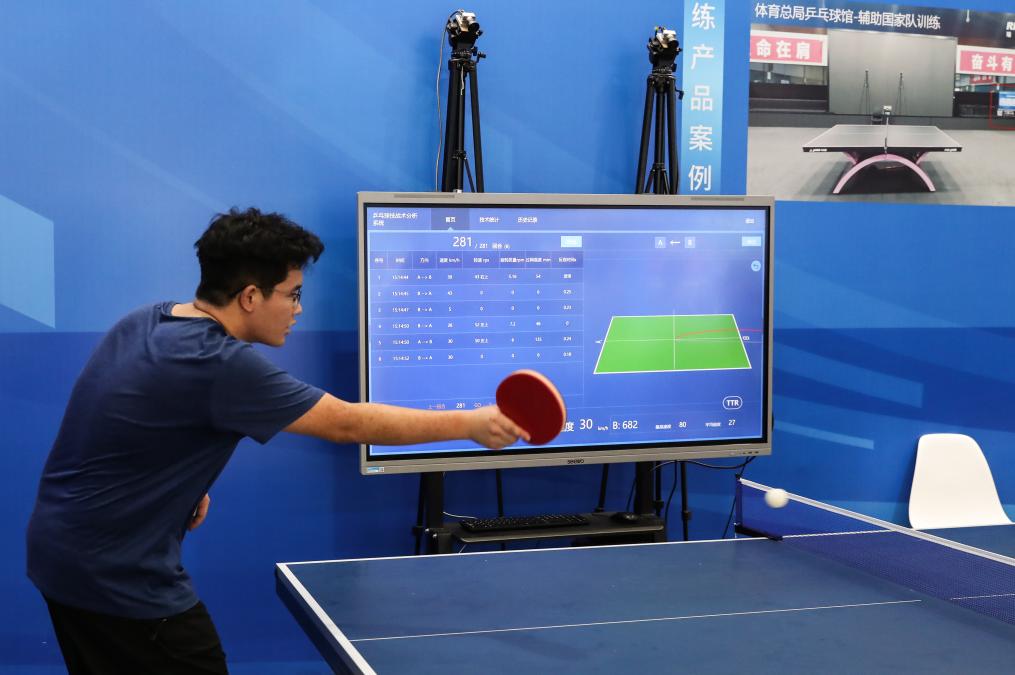这是9月10日在瑞盖科技展区拍摄的乒乓球回放评审系统。