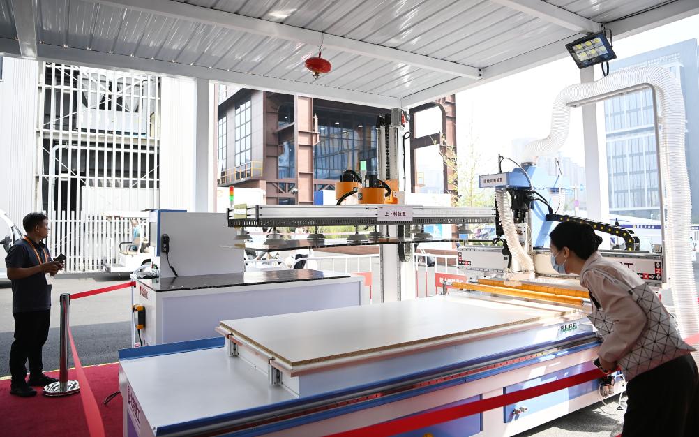 9月11日,在服贸会工程咨询与建筑服务专题展区,参观者(右)在北京建工展台参观智能模板无人工厂。