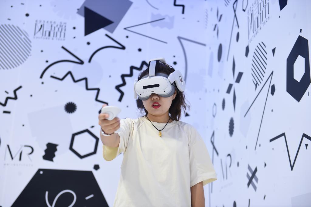 9月11日,参展者在文旅服务专题展区海淀展厅体验沉浸式vr大空间项目。