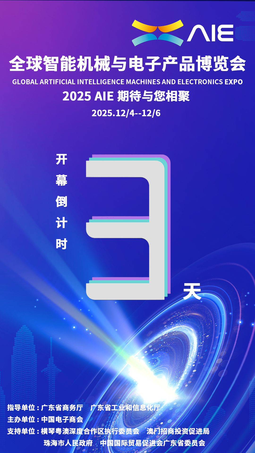2025全球智能机械与电子产品博览会(aie)以“湾区智造 全球共享”为主题,将于12月4日-6日以“一展双城”的模式在澳门和珠海同步举办。展会期间将配套1场开幕式、1个主旨论坛、6大主题展览以及多场分论坛、新品发布活动、科技项目路演等系列活动,届时将有超过1000家全球科技先锋企业、7万名专业观众、5000名国际采购商共襄盛会。