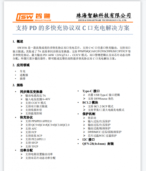 为了解决超高速的快充体验,智融推出了一款全新的支持7a大电流输出的同步降压转换器 pd协议二合一的转换器芯片sw3556,支持单口140w快充输出,支持为120w充电的手机快充。