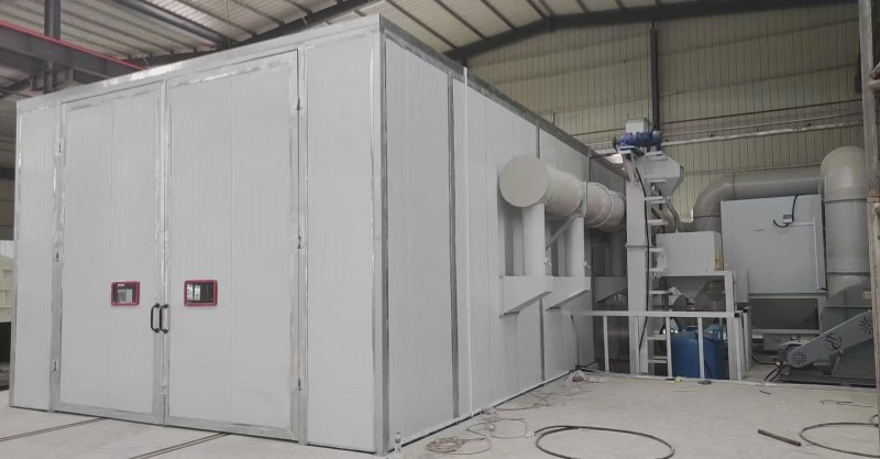 机械回收型喷砂房主要包括方体部分,漏斗格栅,丸料循环回收系统(包括皮带输送机或螺旋输送器,提升机,分离器,储料仓,回转加料阀),除尘系统,承载系统,照明系统,电器控制系统,三维升降平台等。